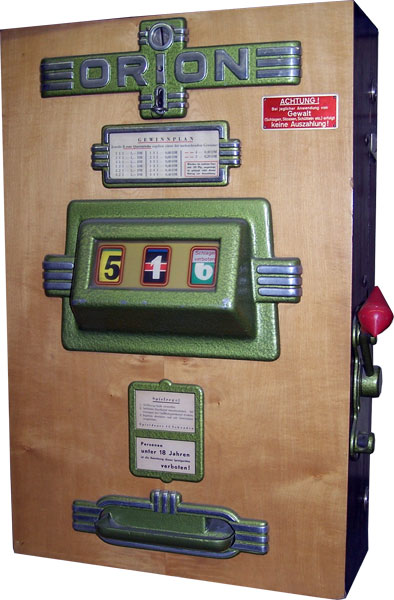 Im Gegensatz zum NOVOMAT ist beim ORION die Möglichkeit der Betätigung in Fortfall gekommen und die Kombination weist einen neuen, interessanten Spieleffekt auf: Selbst, wenn auf der ersten und/oder zweiten Walze eine Niete erscheint, besteht immer noch die Möglichkeit, auf der dritten Walze einen 20-Pfennig-Gewinn zu erzielen. Dieser ist, abweichend von den übrigen Zahlen, als .,20 Pfennig" gekennzeichnet, so daß dem Spieler bis zum letzten Augenblick die Entscheidung, ob es sich um einen Gewinn oder Verlust handelt, offen steht.