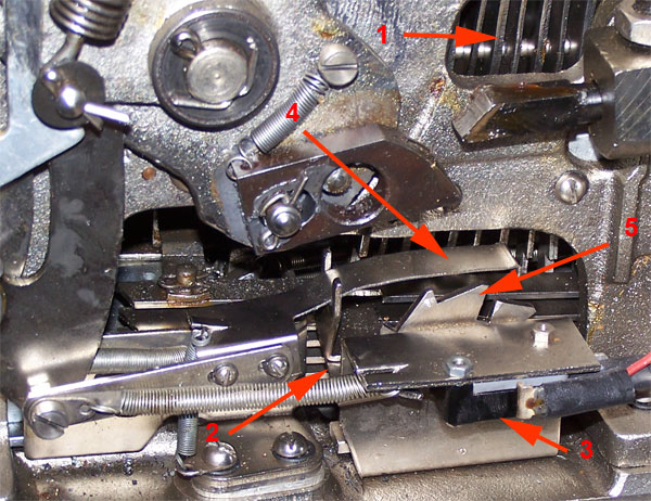 Das obige Bild zeigt die Bauteile zur Steuerung des "Sonderspiels". Für jede Walze gibt es eine Lochscheibe auf der Hauptwelle, wobei die verschiedenen Löcher und Stellungen der Lochscheiben untereinander alle möglichen Gewinne nachbilden. Nach Stillstand der Maschine ermitteln die Abtastfinger (1) von den Lochscheiben den möglichen Gewinn. Bei einen Gewinn wird die entsprechende Anzahl der Auszahlschieber betätigt. Für den Sonderfall "Sonderspiel" werden alle Abtastfinger (bis auf die für die erste Walze) mechanisch in Gewinnstellung verriegelt und das "Zählwerk" (2) durch Verschieben der Achse aktiviert. Gleichzeitig erfolgt über den Mikrotaster das Einschalten der 1DM Lampe an der Frontseite. Beim nächsten Spiel wird mit dem Starthebel über die Wippe (4) das Zählrad (5) eine Stellung weitergedreht. In der letzten Stellung (im Bild unter dem Pfeil 5) ist ein Schlitz, wodurch die Entrieglung erfolgt und das "Sonderspiel" ist beendet. Der mögliche Gesamtgewinn beträgt nicht 10,- DM sondern nur 9,- DM, da auch beim "Sonderspiel" ein Einsatz von 10 Pfg. notwendig ist.
